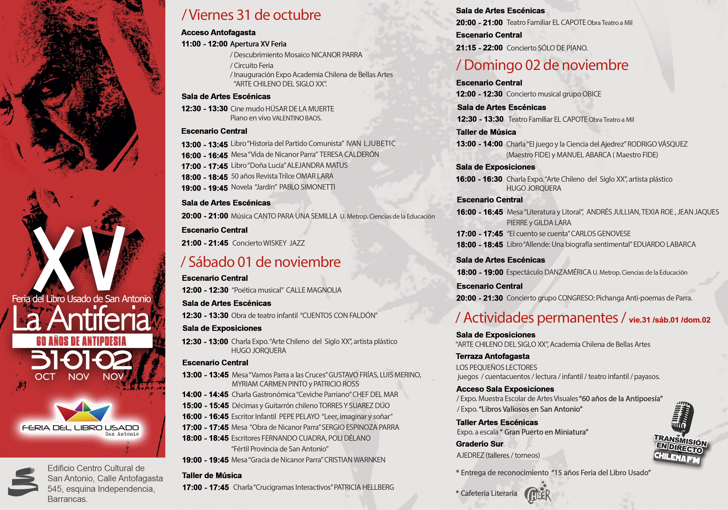 Además podemos destacar a Cristián Warnken, conocido por el programa “La belleza de pensar”, Pepe Pelayo, escritor cubano destacado en cuentacuentos, Teresa Calderón, poetisa y narradora chilena y El grupo musical Congreso que viene con su show de Pichanga Anti-poemas de Parra, entre muchos más importantes expositores que harán de esta XV Feria del libro usado de San Antonio, un espectáculo inolvidable para la provincia.