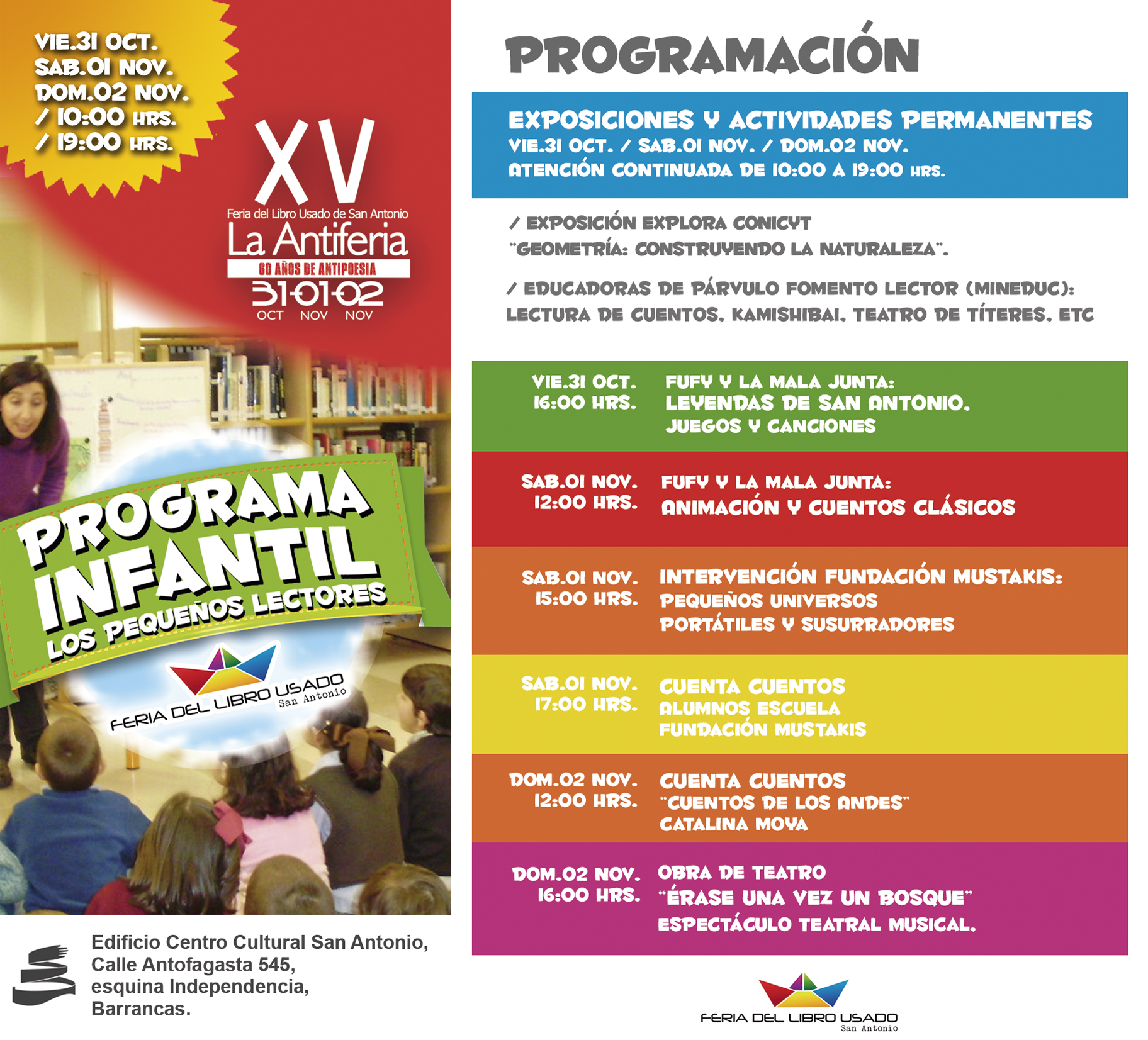 La XV Feria del Libro usado de San Antonio no quiere dejar fuera a ningún habitante de la provincia, teatro, danza, exposiciones, escritores, música y más podrán encontrar en el corazón del Centro Cultural de San Antonio, que por segunda vez será la casa de esta XV Feria.